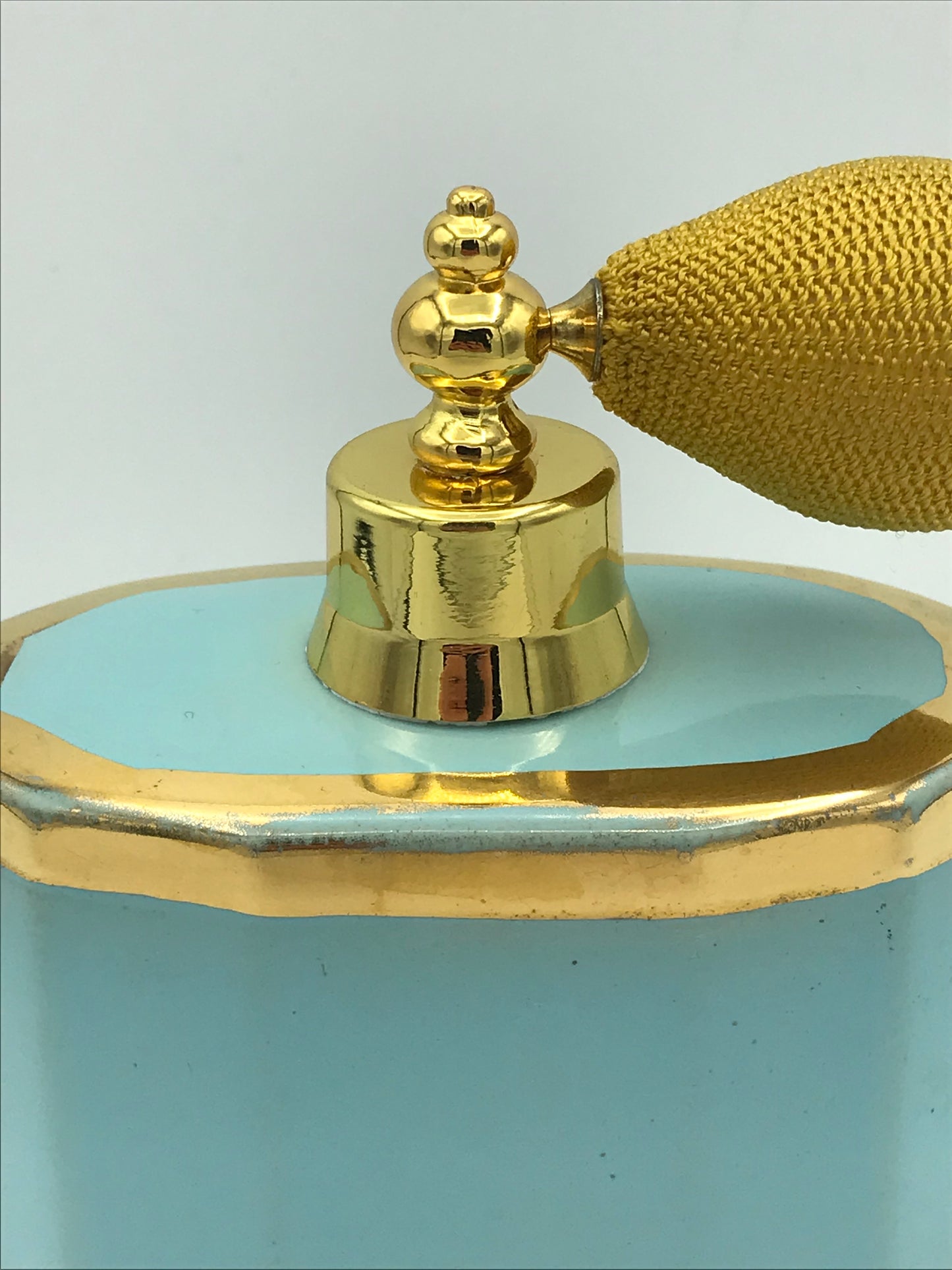 Pastel blue porcelain perfume spray highlighted with a painted gold border.
