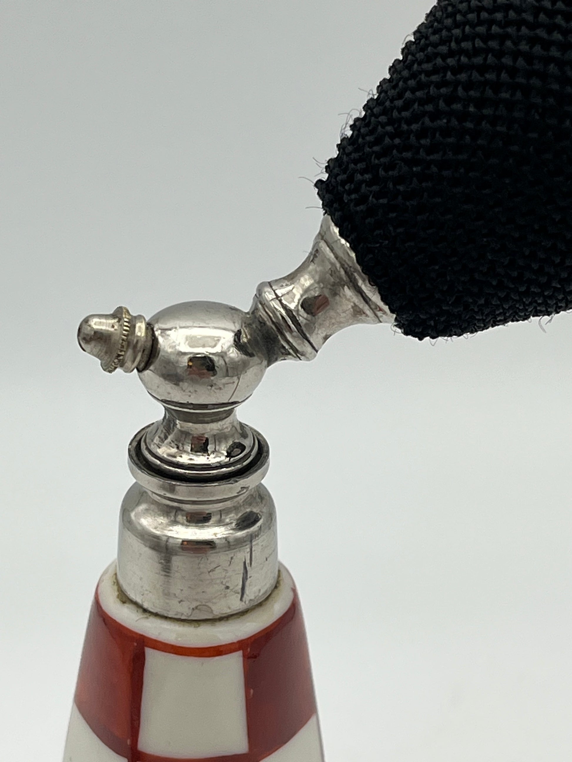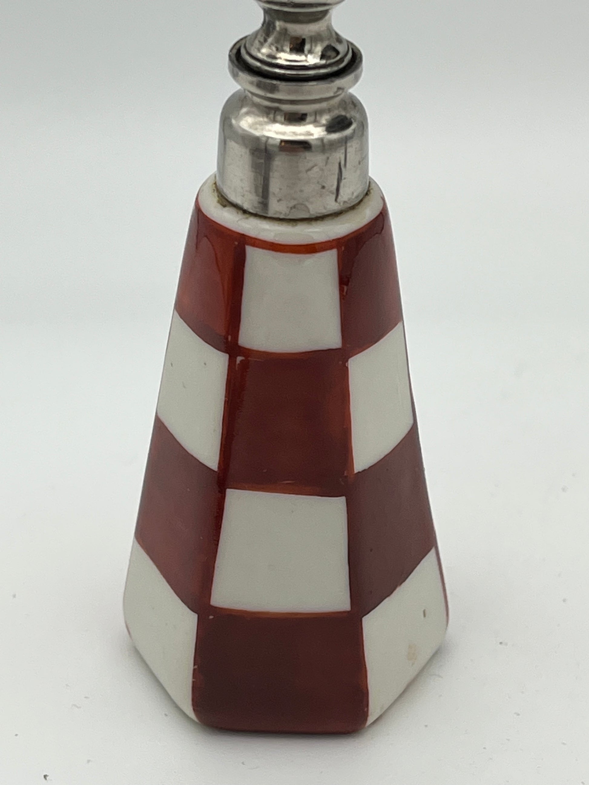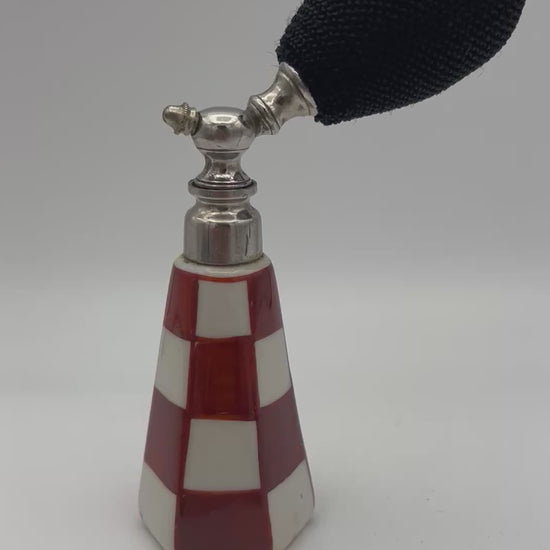 Son flacon conique, de petite taille (6 cm), offre un décor de damier rouge et blanc. Il est équipé de sa monture chromée avec poire fixe filet noir.