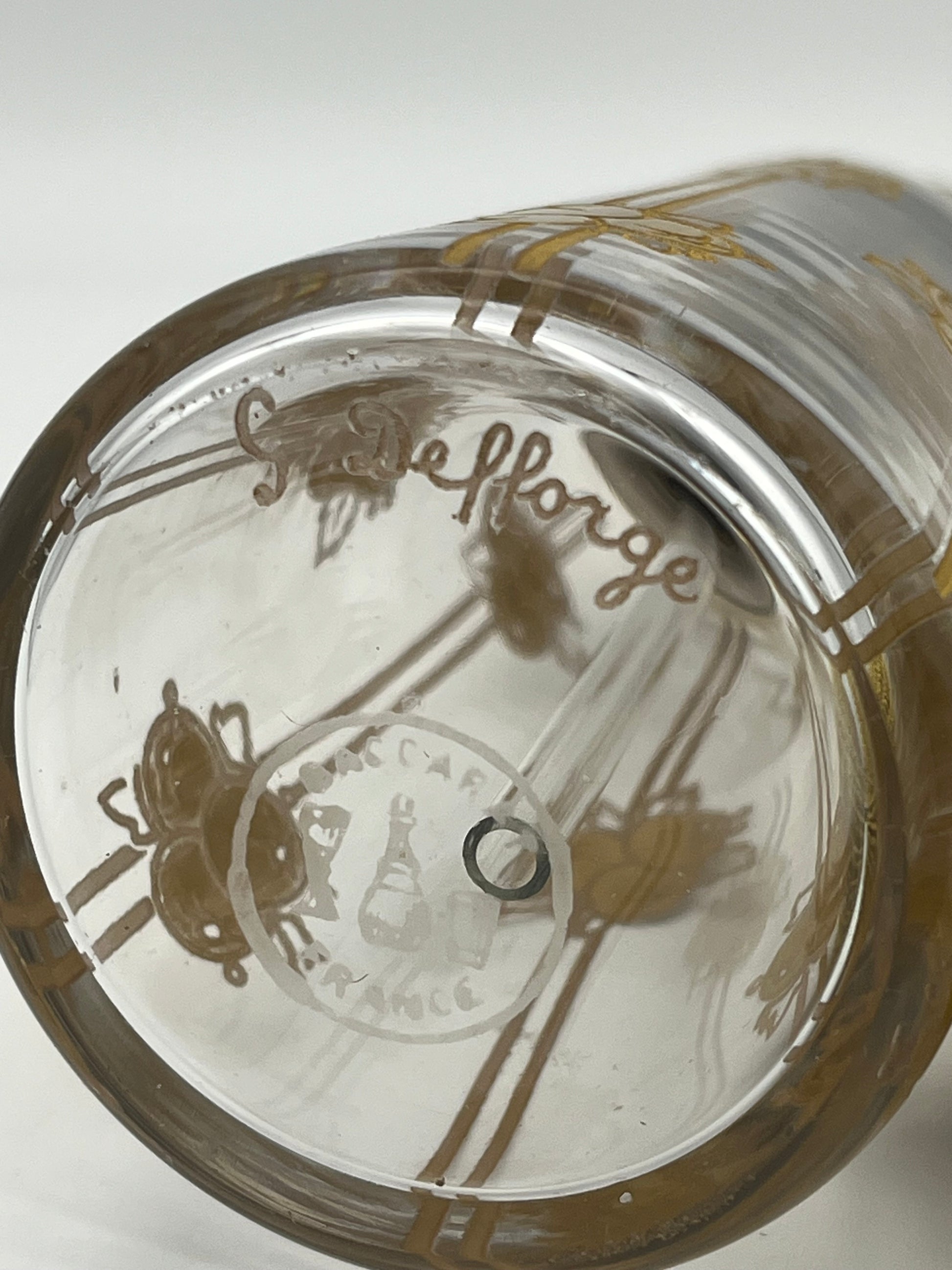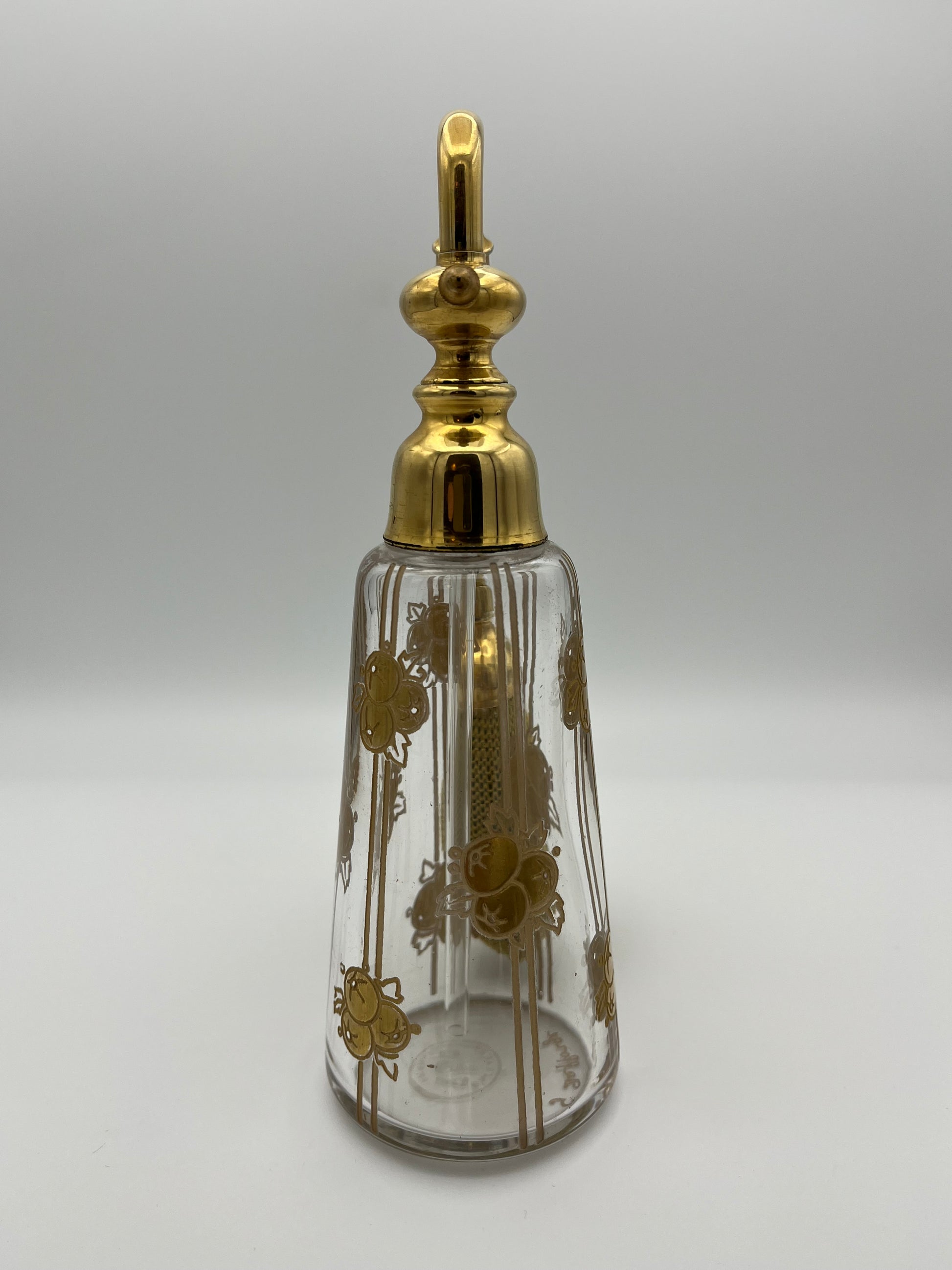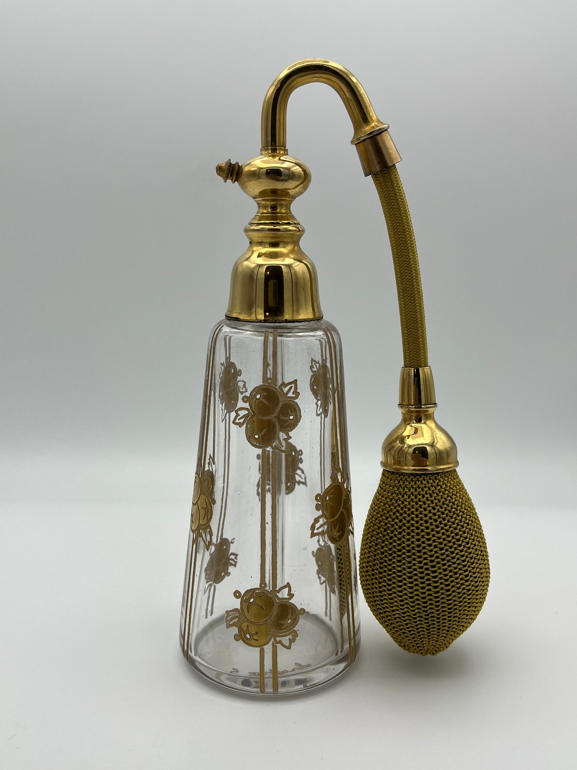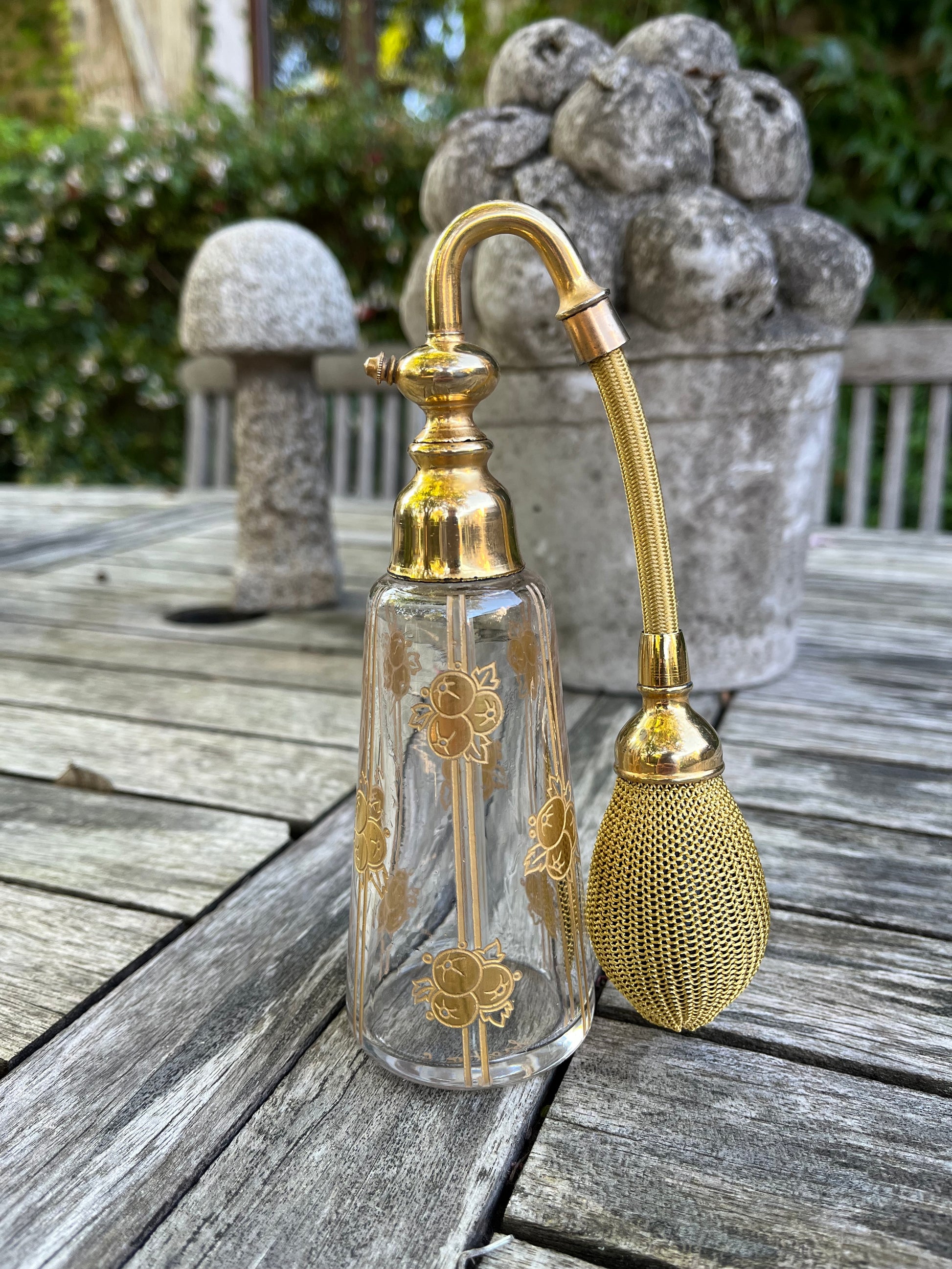 Son flacon, de forme conique, est en cristal clair avec un décor de mandarines peint par le décorateur émailleur G Defforge. Il est équipé de sa monture col de cygne avec sa poire tombante filet or.