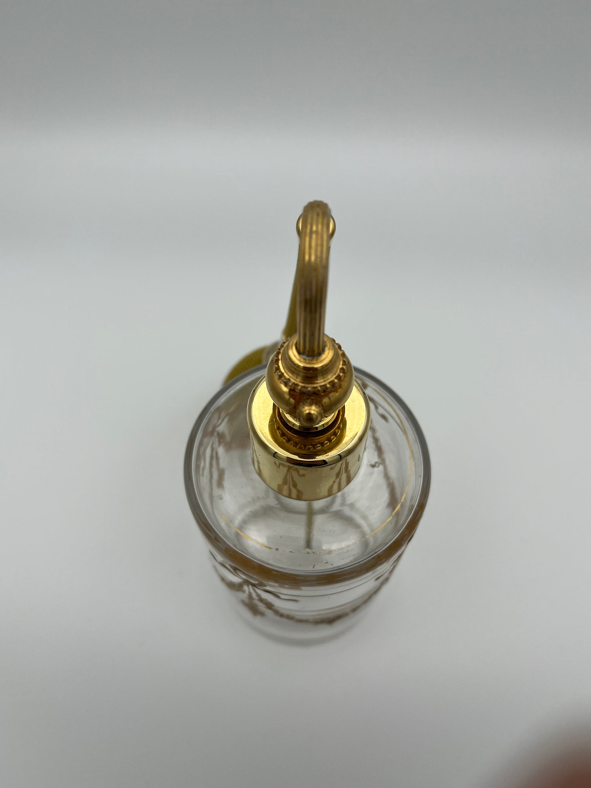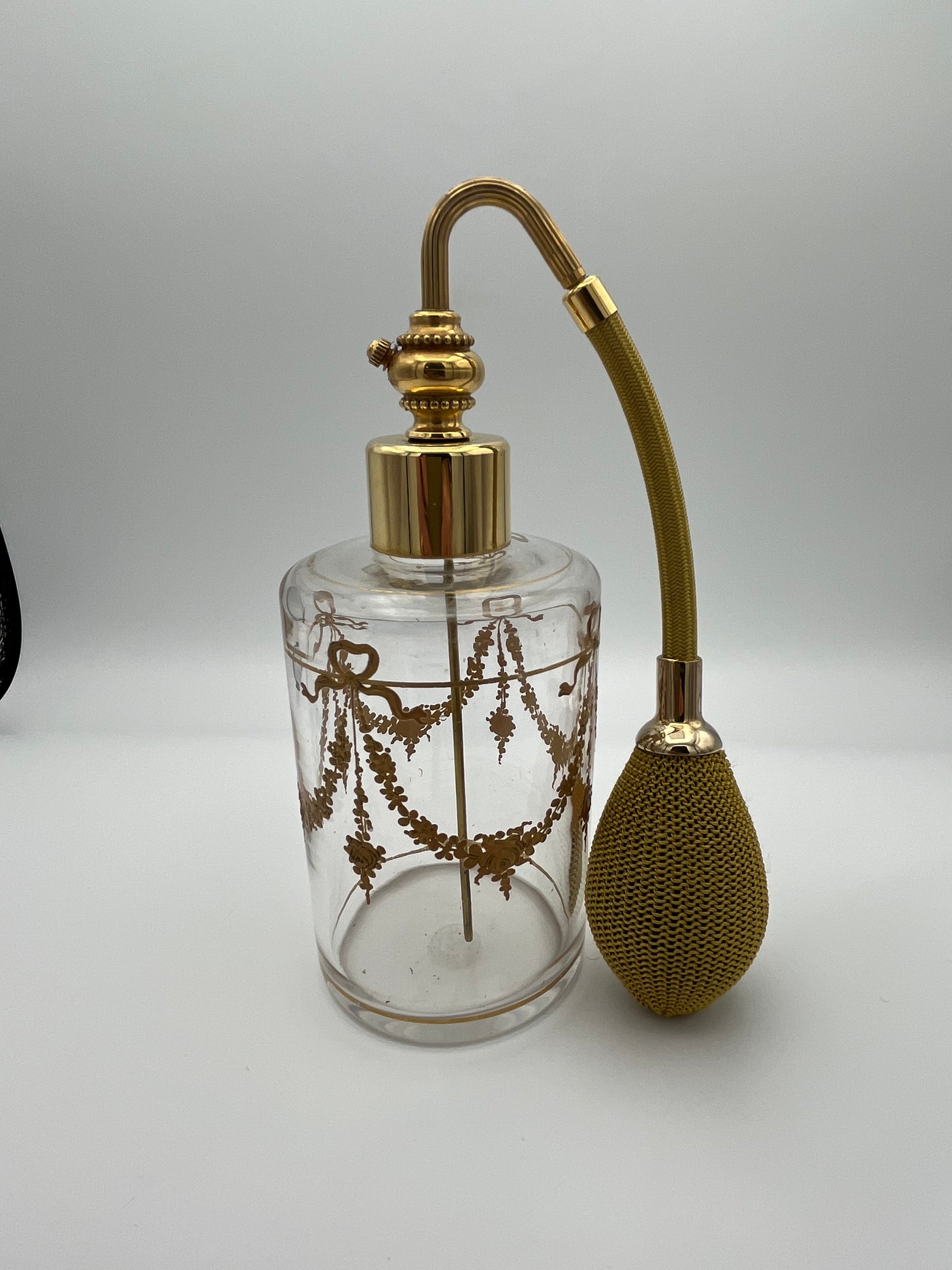 Son flacon, de forme tronconique, est en cristal clair, décor de guirlandes de fleurs et noeuds peint couleur or. Il est équipé de sa monture perle dorée et sa poire tombante filet et tube gainé or.