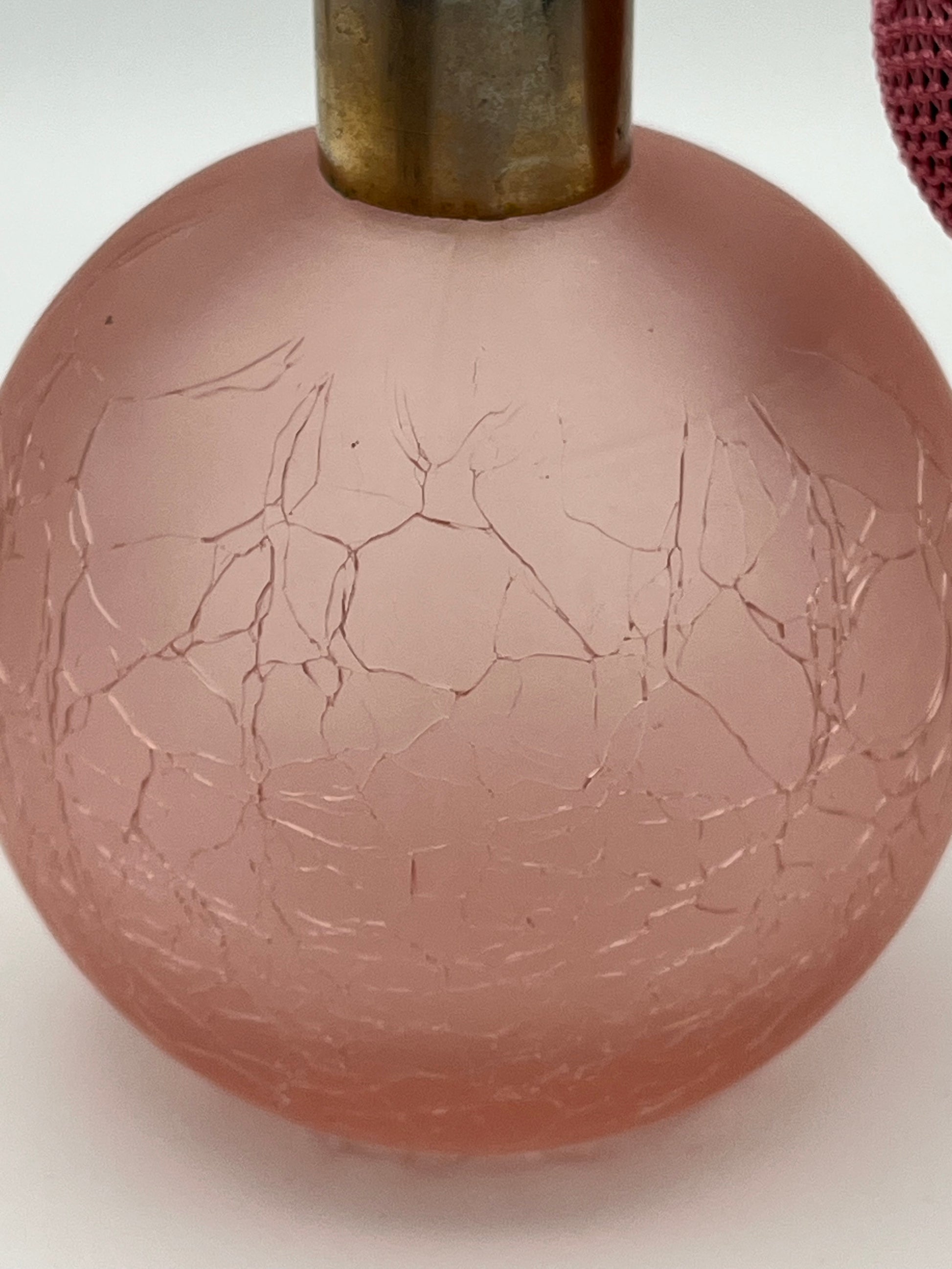 Son flacon, forme boule, est en verre craquelé rose, équipé de sa monture fixe avec sa poire filet rose.