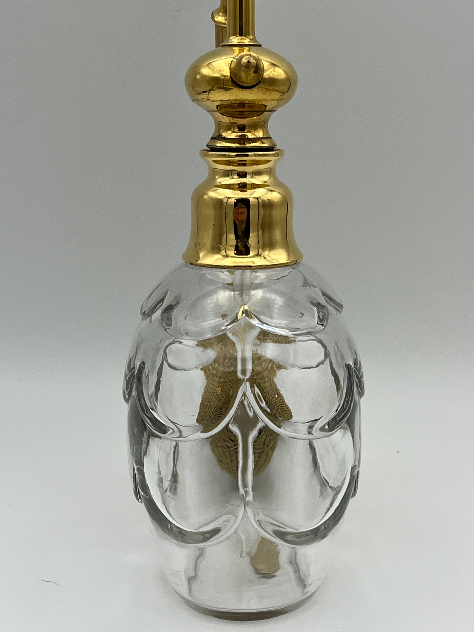 Son flacon en cristal clair, décor de vagues en relief, est équipé de sa monture col de cygne dorée et sa poire tombante tube gainé et filet or.