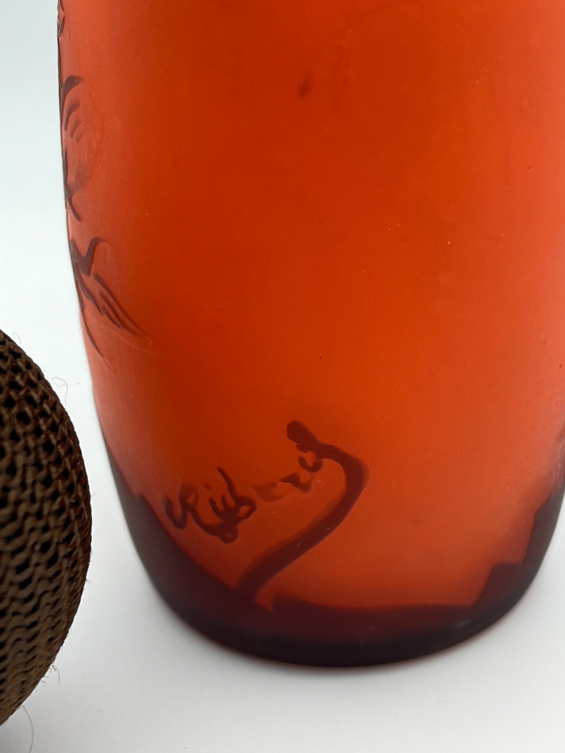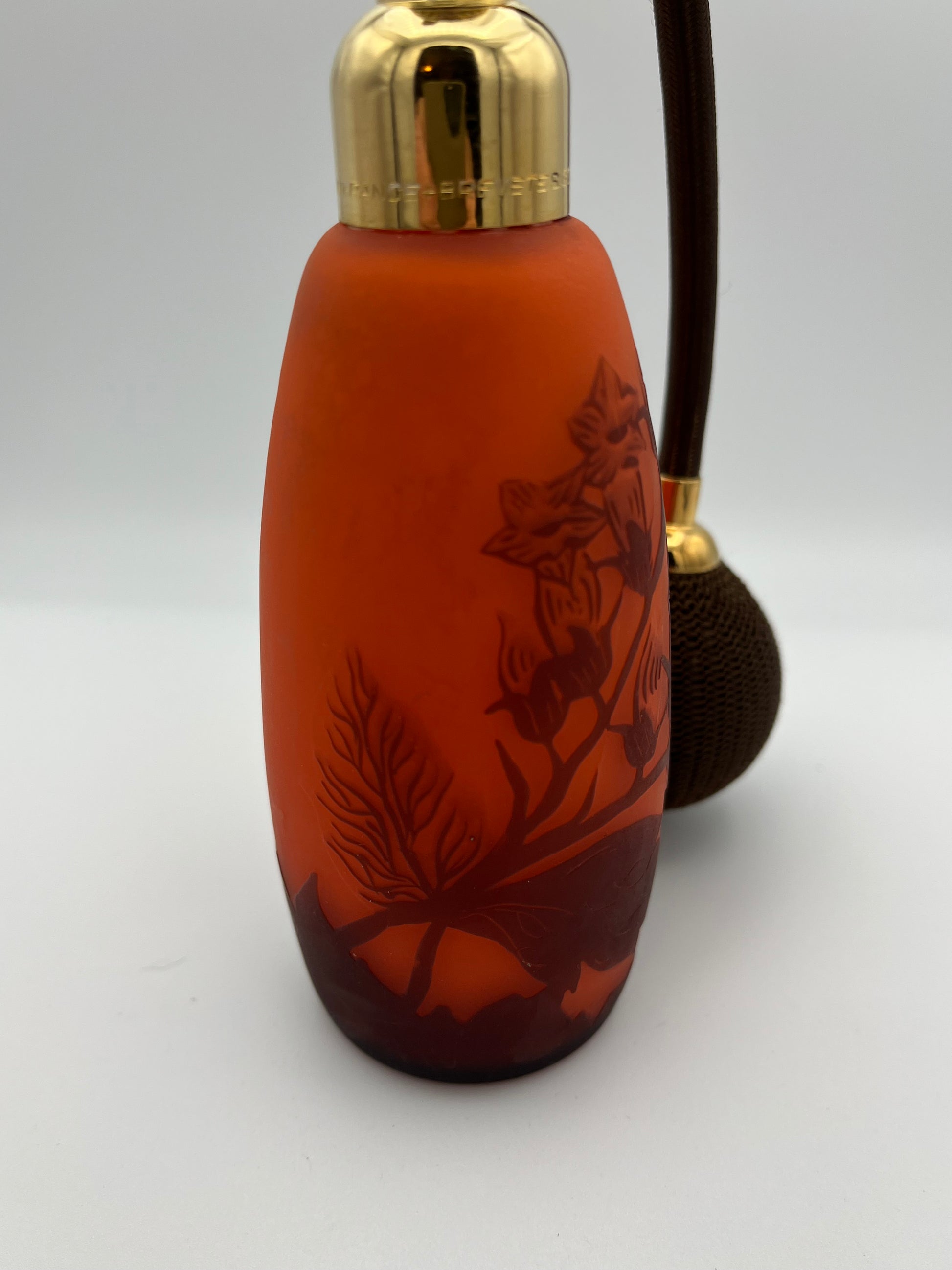 Son flacon est en verre multi-couche, dégagé à l'acide, décor de fleur marron sur fond rouge orangé. Il est équipé de sa monture Marie-Louise perle et sa poire boule filet marron.