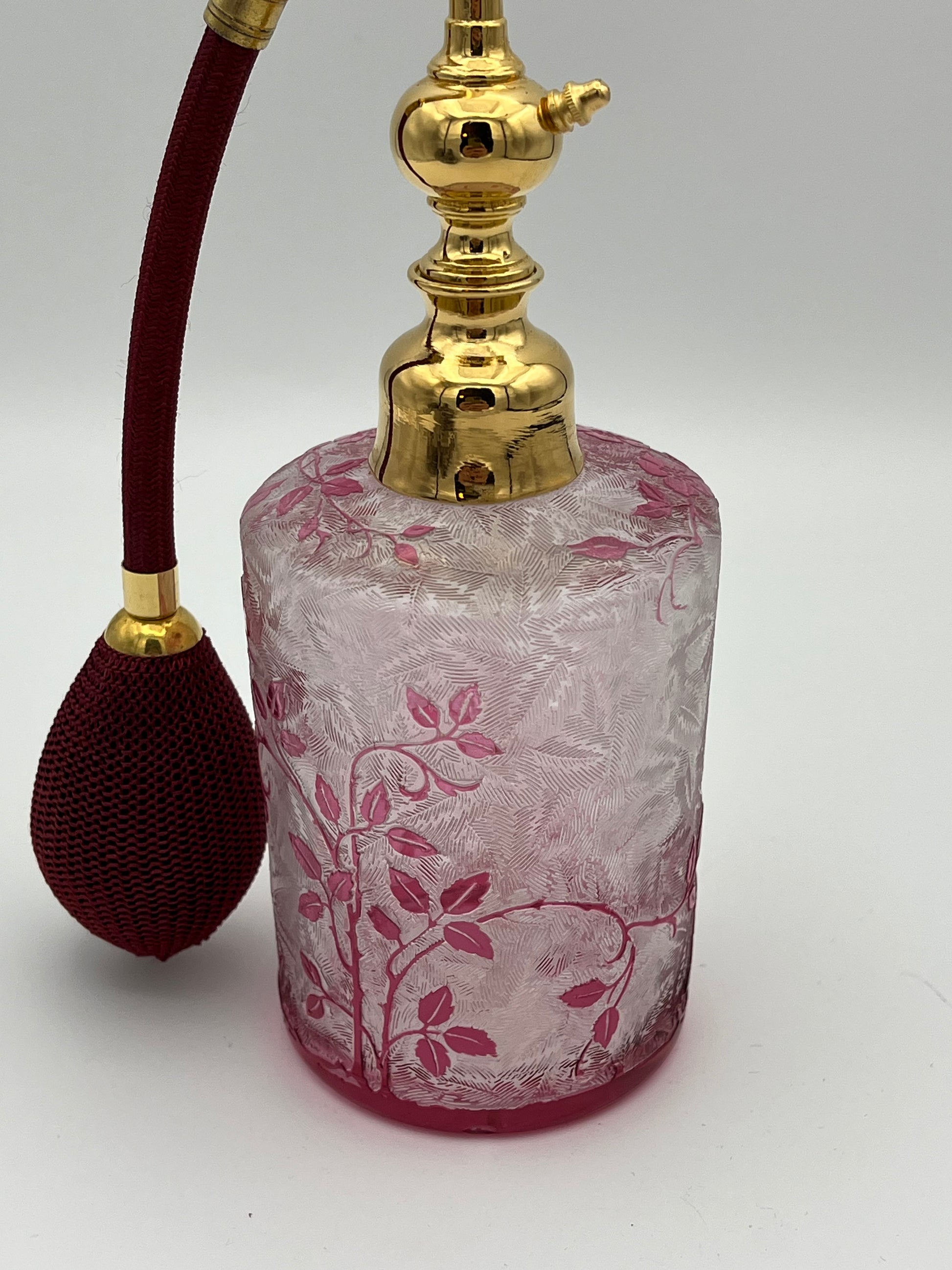 Son charmant flacon est en cristal givré, décor de feuillage doublé rose. Il est équipé de sa monture col de cygne dorée avec tube gainé et poire filet bordeaux.
