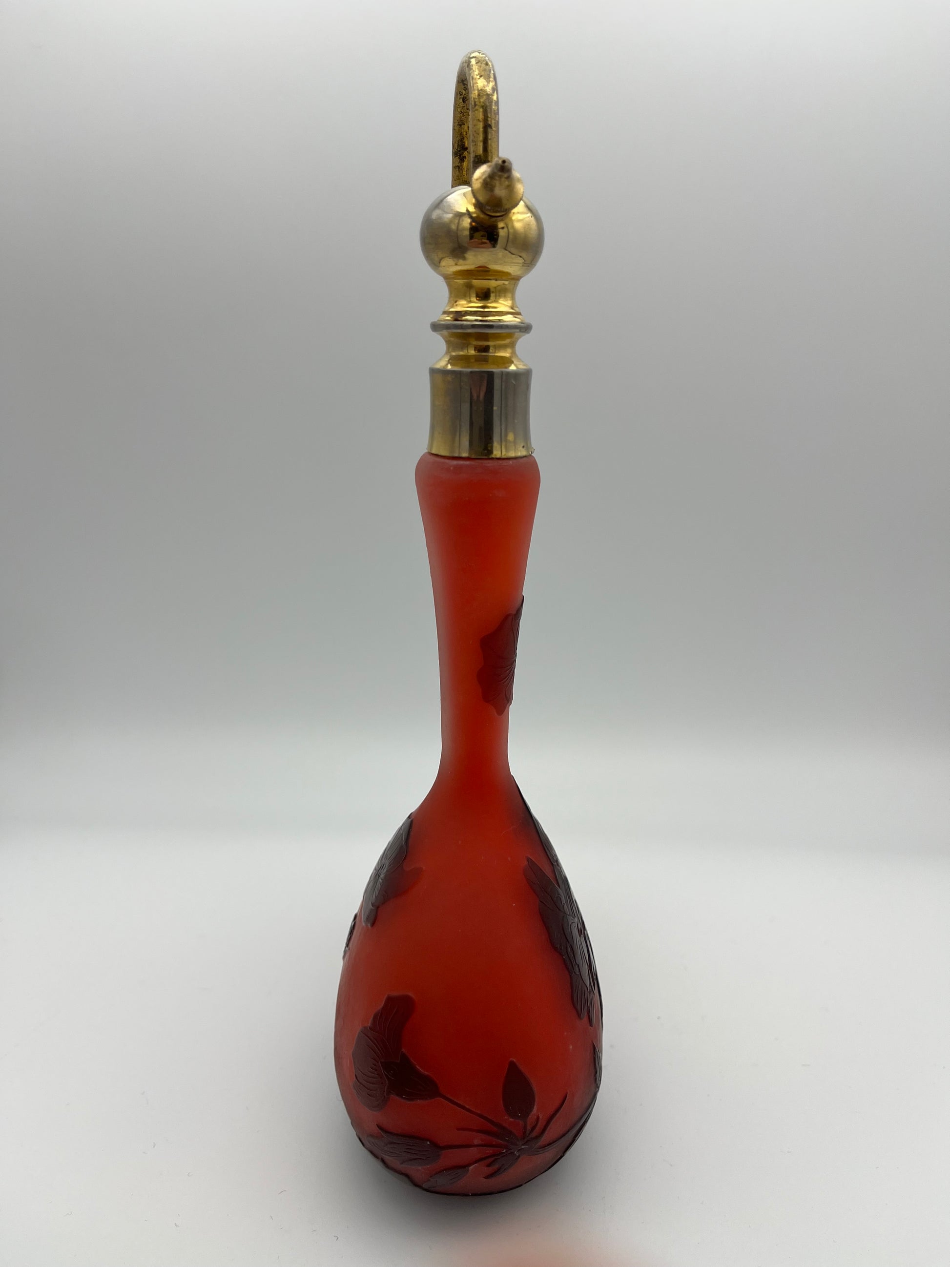 Magnifique flacon offrant un décor de fleurs couleur prune sur fond rouge-orangé, à long col tubulaire conique sur base renflée gourde, en verre multi-couche dégagé à l'acide.