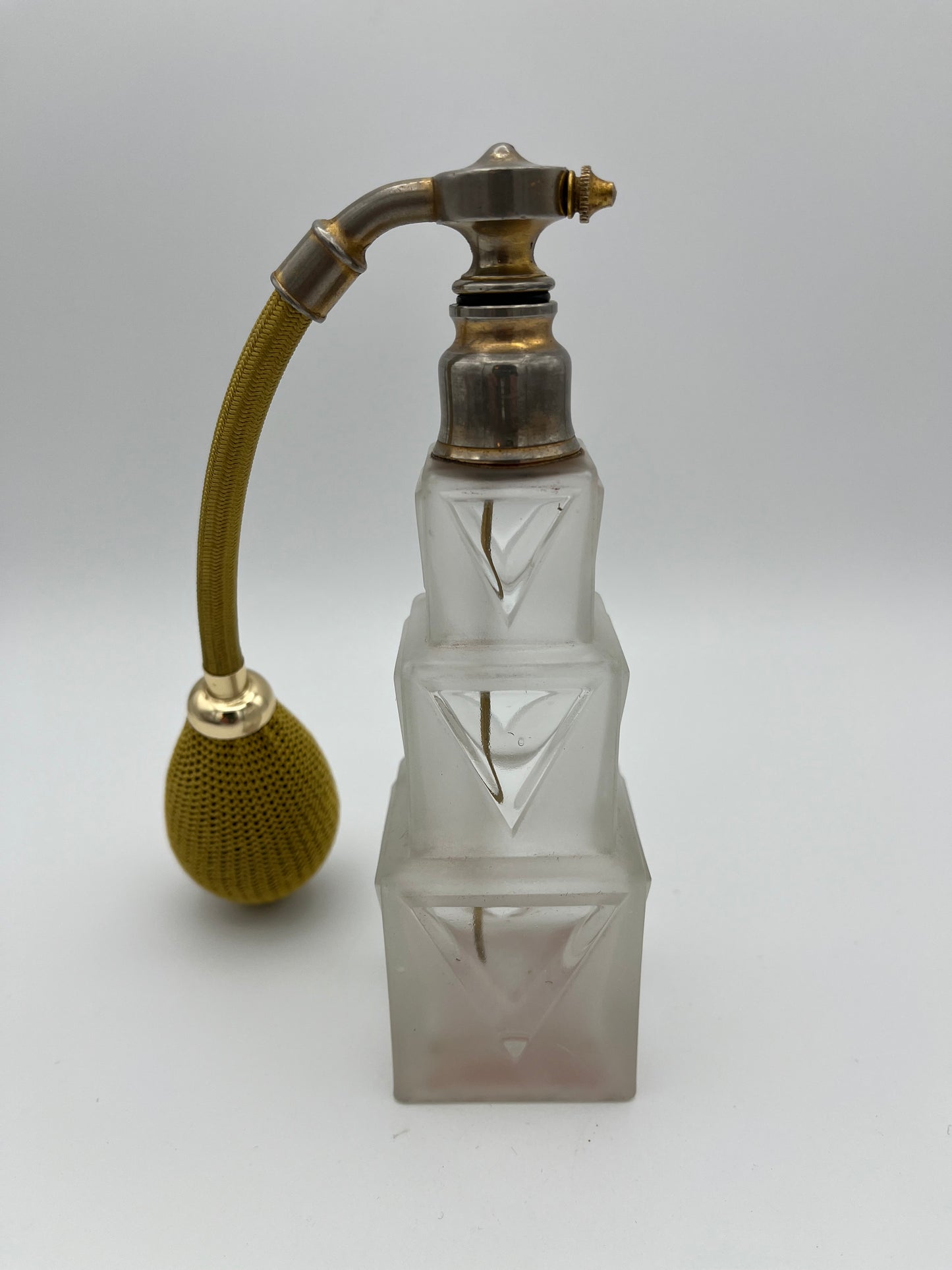 Son flacon est en verre moulé, pressé, modèle rare Art déco, en forme de cubes empilés satiné et blanc. Il est équipé de sa monture d'origine dorée patinée et sa poire tombante filet et tube gainé or.