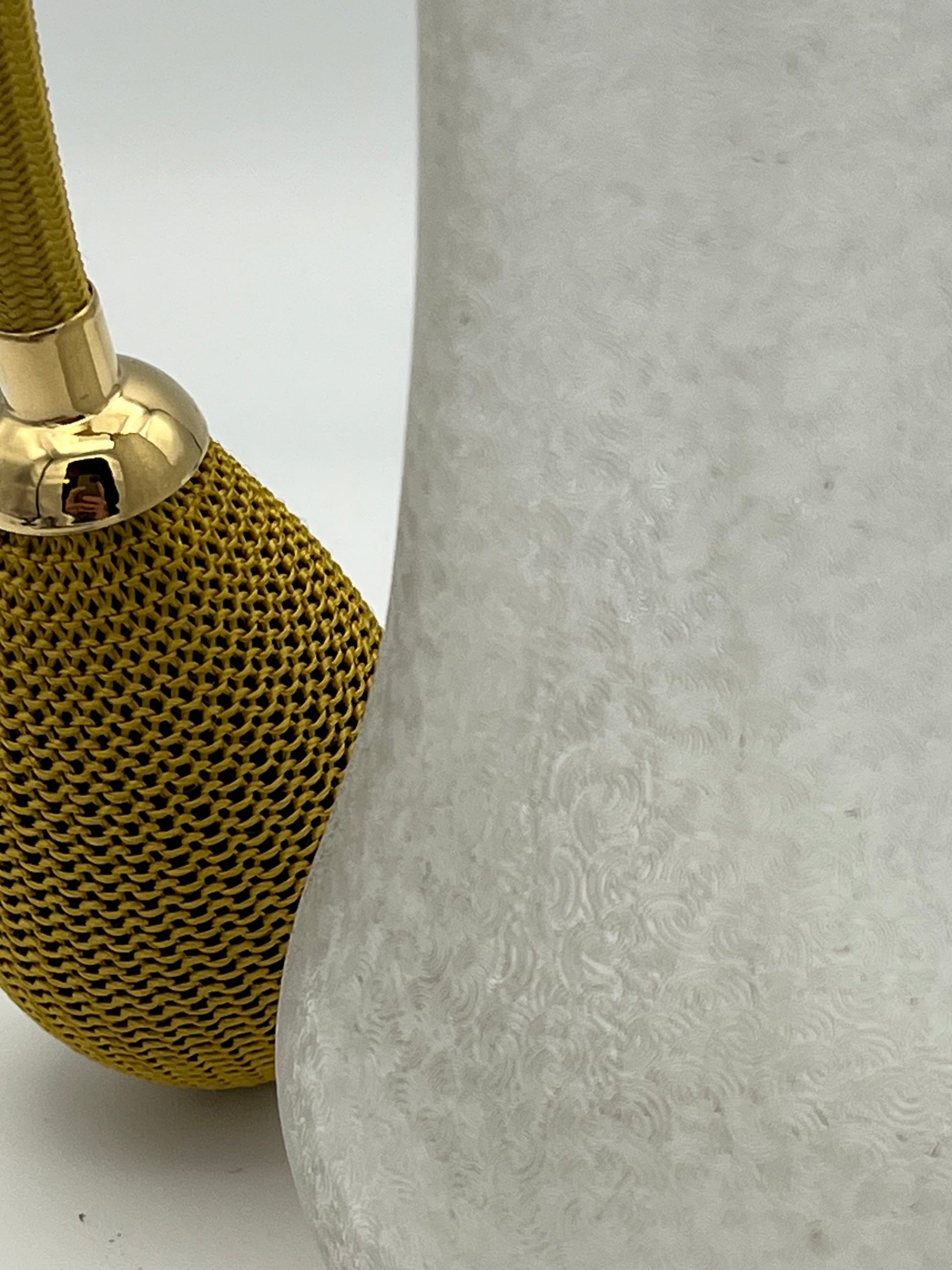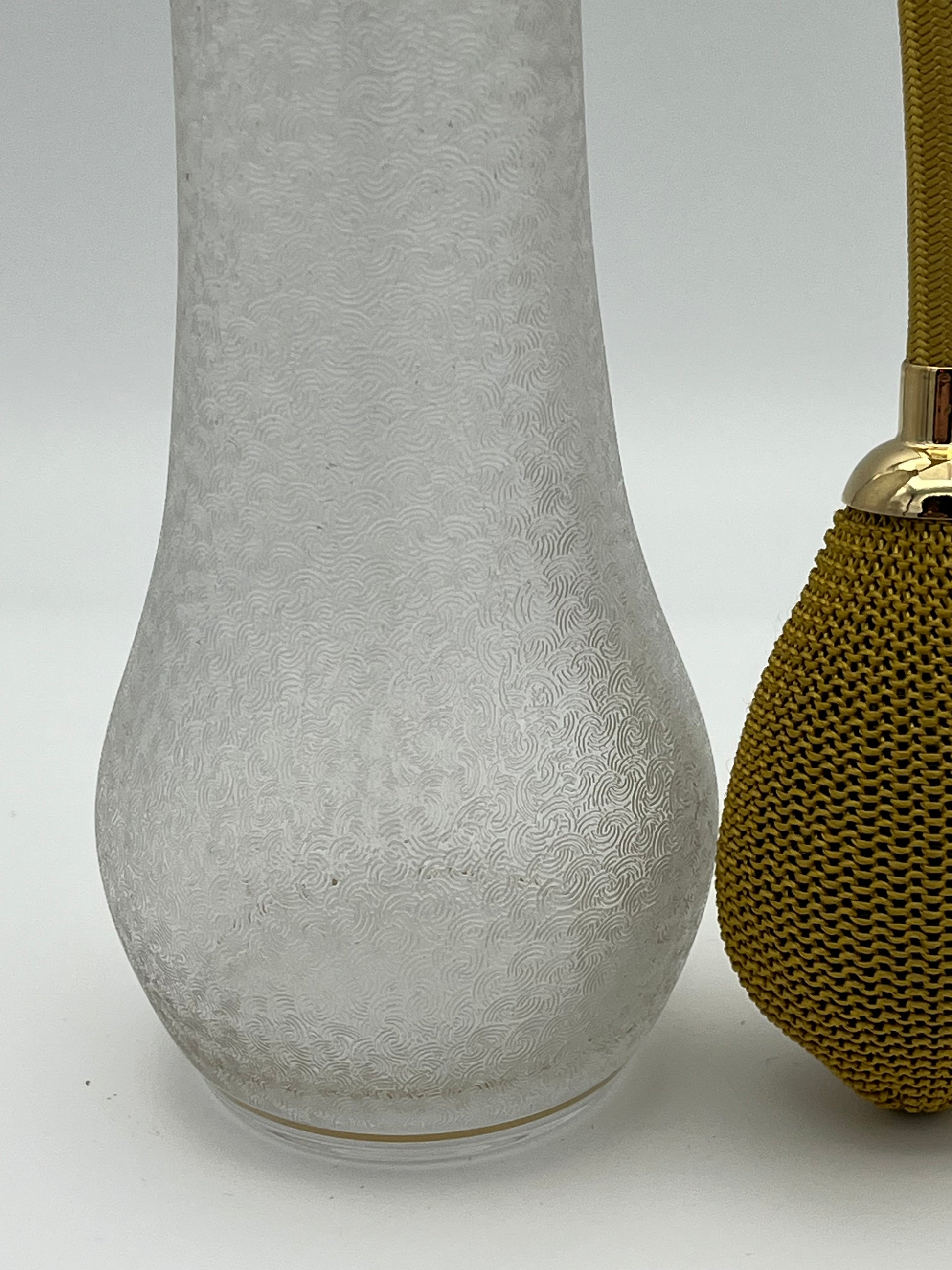 Son flacon est en cristal décor givré à base renflée, liseré or haut et bas. Il est équipé de sa monture col de cygne dorée avec sa poire tombante filet or.